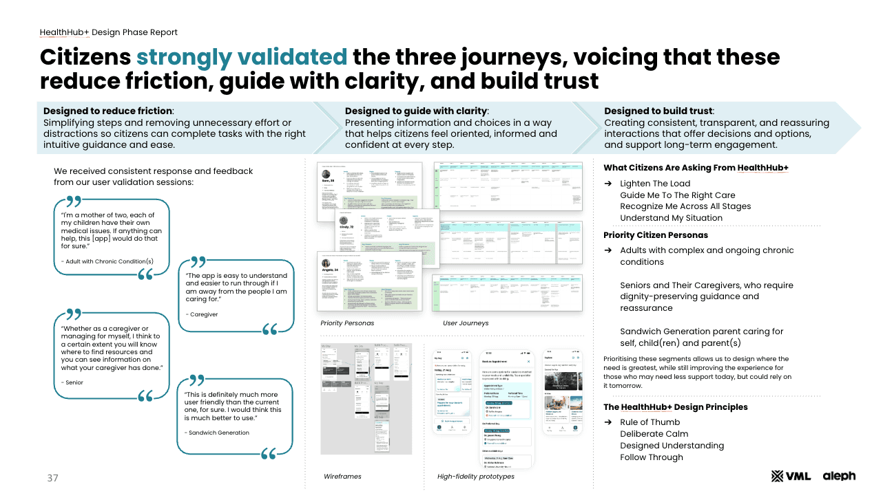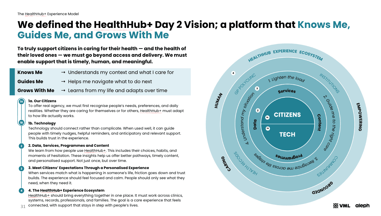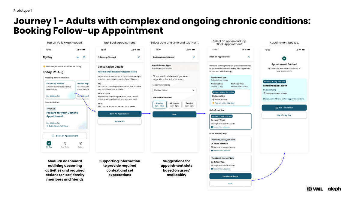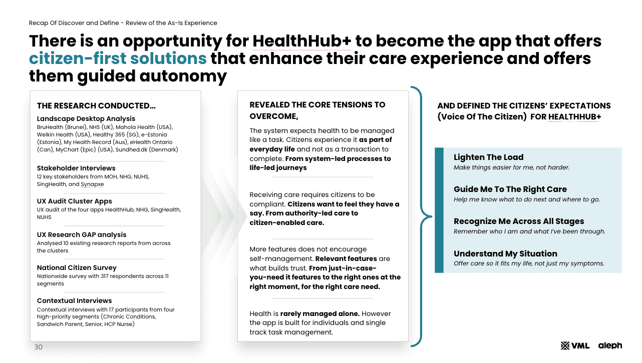 Each cluster had its own app with overlapping functions; appointment booking, medication tracking, health records, caregiver access, payments. But the apps were policy-led and siloed; citizens had to manage fragmented journeys and download multiple apps just to care for themselves or their families.