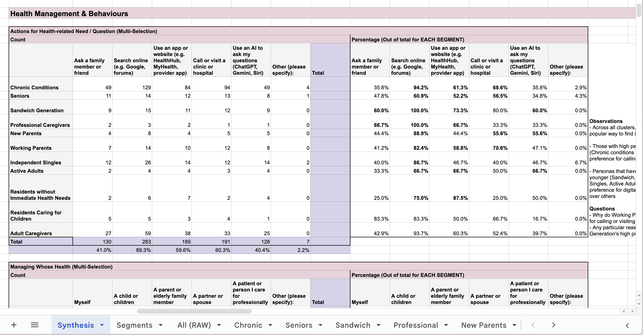 Identified key segments like chronic condition patients and family caregivers to focus our personas and journeys